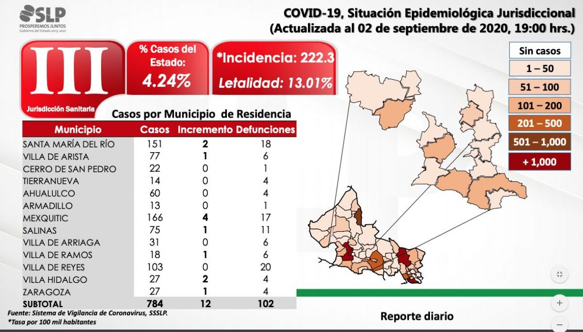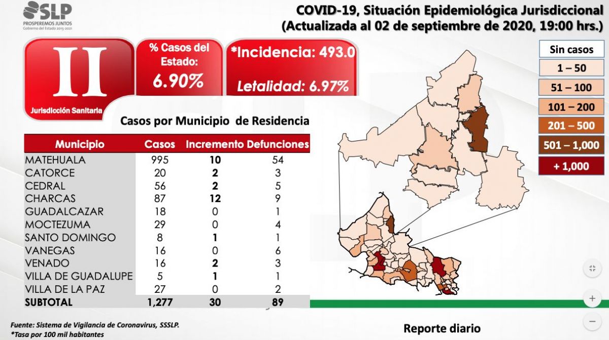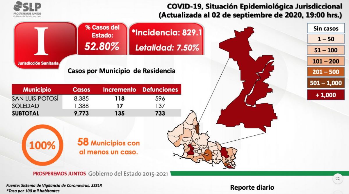 SLP suma 18 mil 510 casos positivos y 1,379 defunciones desde el inicio de la pandemia. La tasa de letalidad aumenta y se encuentra en 7.45 % por cada 100 infectados.