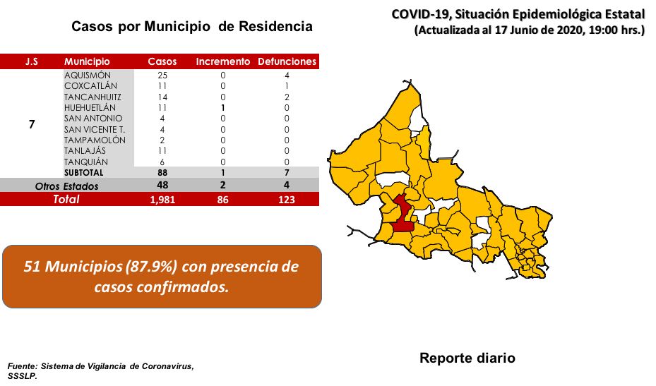 De todos ellos, 44 son de San Luis Potosí, 11 de Ciudad Valles, 8 de Tamazunchale, 5 de Soledad, 4 de Xilitla; 3 de Axtla de Terrazas y Matlapa, 2 de Villa de Reyes; y 1 en Santa María del Río, Villa de Arista, Ciudad Fernández y Huehuetlán, respectivamente; así como los dos casos de otro estado. Los demás casos se encuentran de la siguiente forma, según su jurisdicción sanitaria y su municipio: