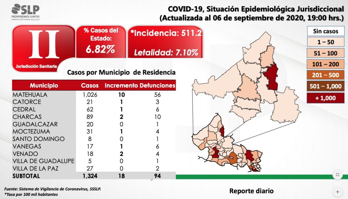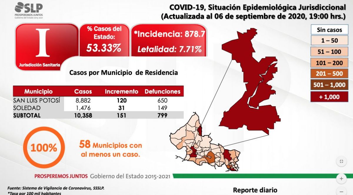 La capital potosina continúa como el municipio con mayor número de contagios Covid, seguido de Valles, Soledad y Tamazunchale.