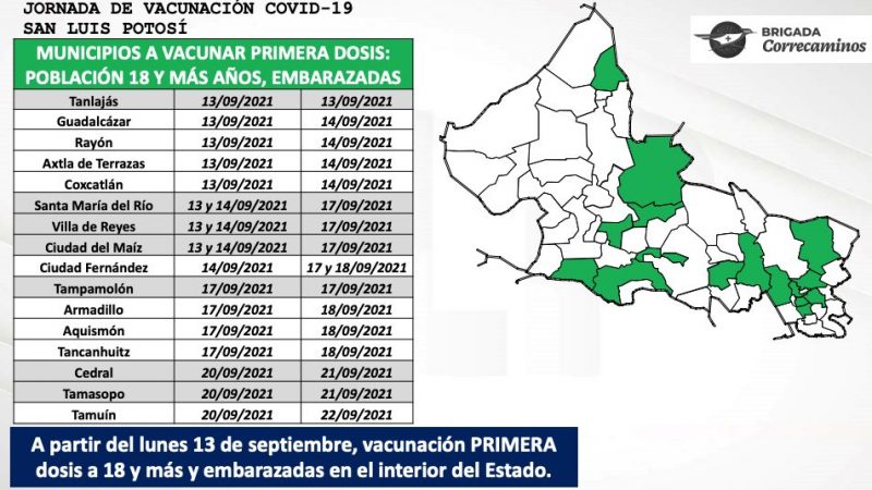 En cuanto a la jornada de vacunación se informa que durante esta semana se estará aplicando la segunda dosis a perosonas entre 18 y 29 años de Rioverde y Ciudad Valles, invitan a la ciudadanía a acudir y concluir su esquema de vacunación.