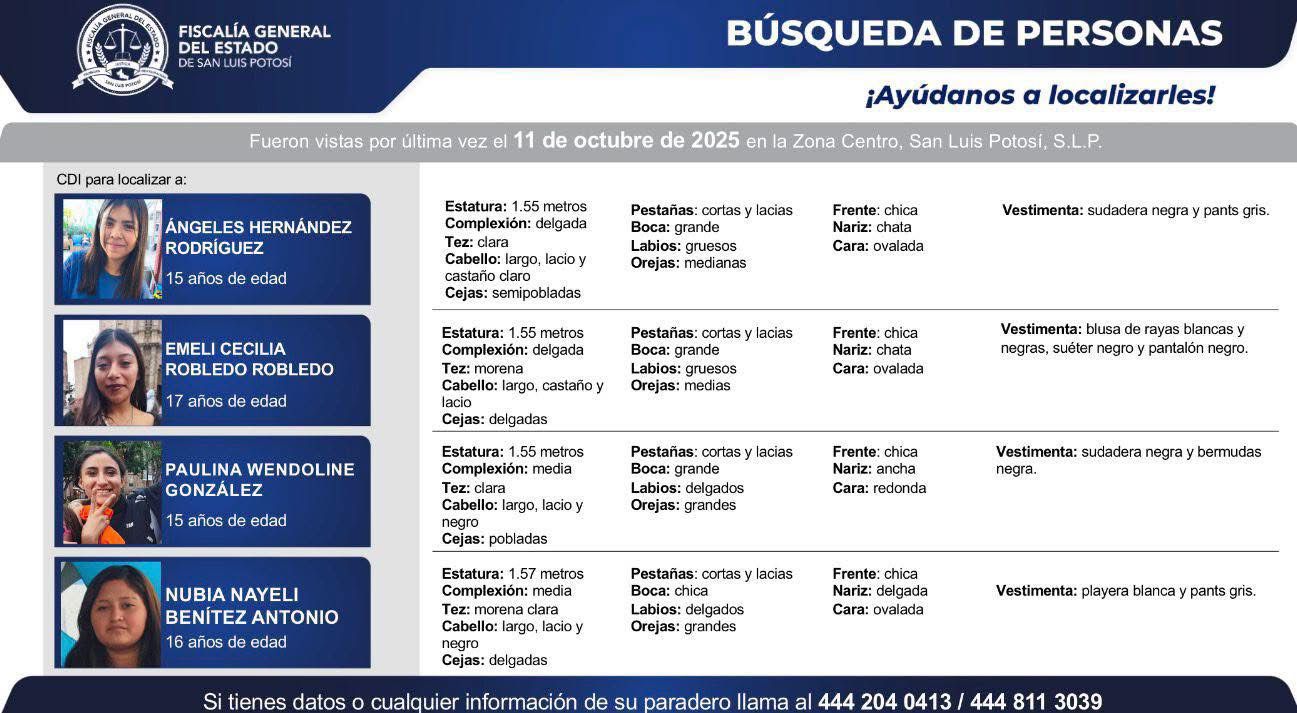 La Fiscalía General del Estado de San Luis Potosí emitió una ficha de búsqueda para localizar a cuatro adolescentes que fueron vistas por última vez este sábado en la Zona Centro de la capital potosina.