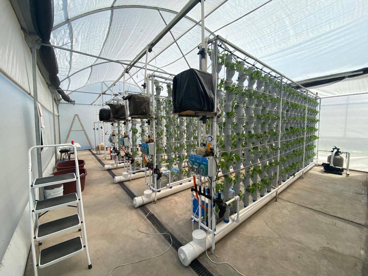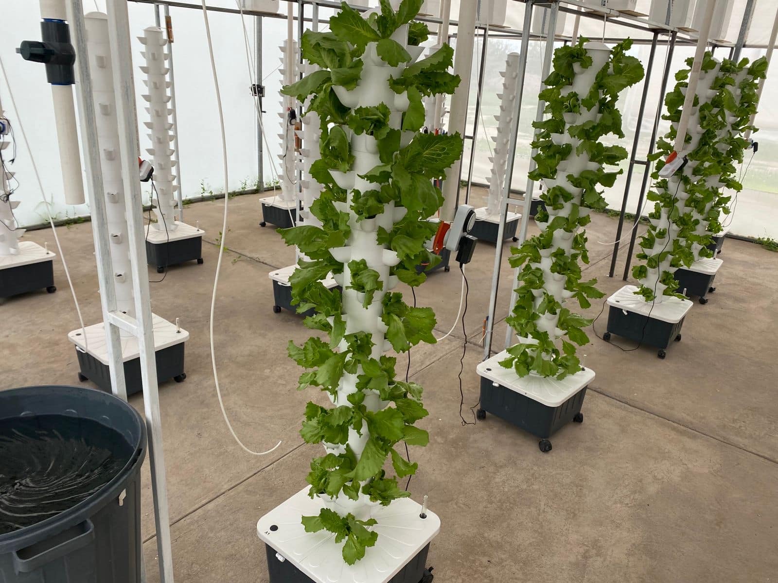 La infraestructura incluye sistemas de cultivo en torres verticales GrowPipes, con capacidad de hasta 300 plantas por torre, así como torres hidropónicas TIRUSS, optimizadas para fertirriego y producción de alta densidad.