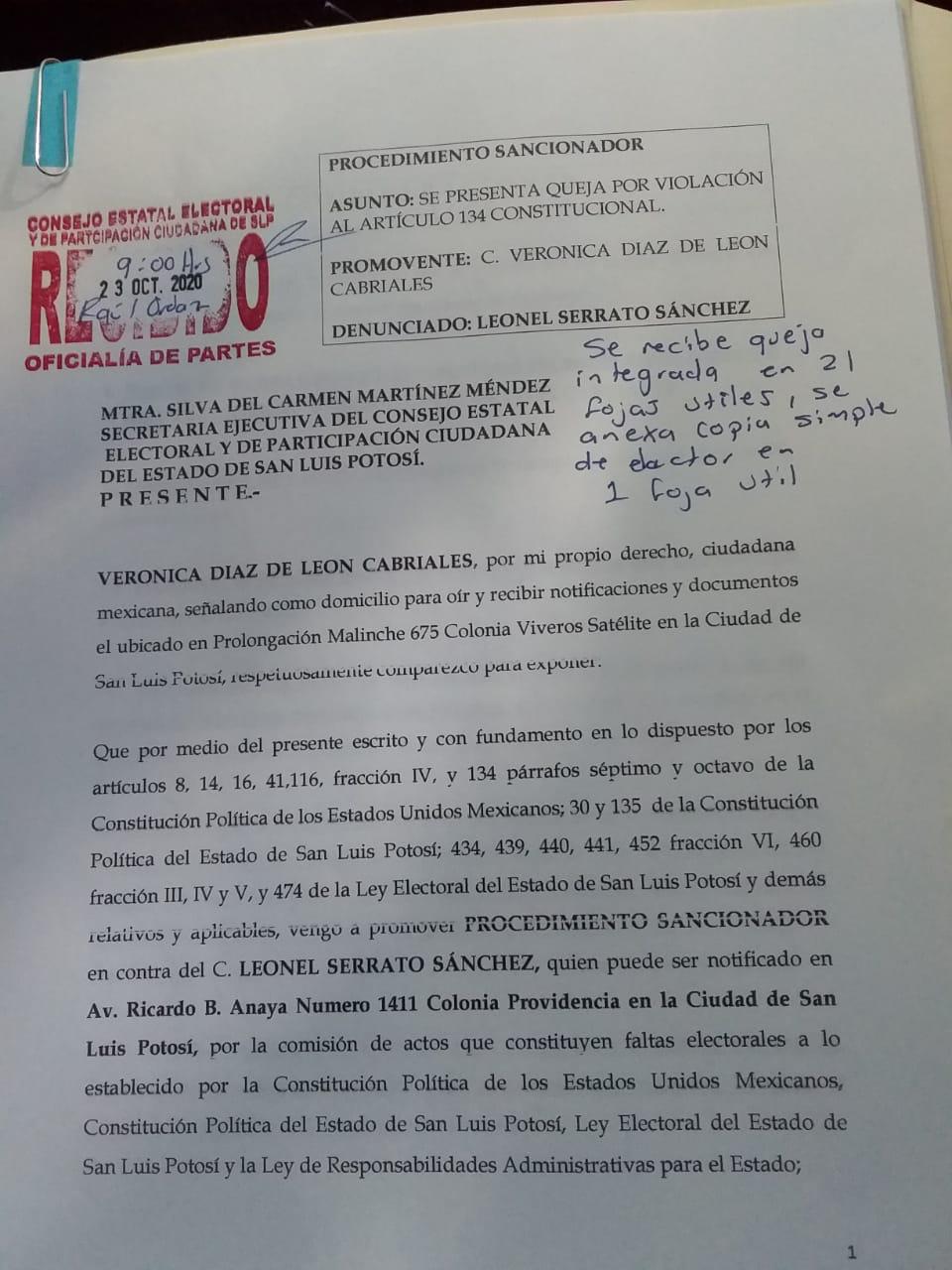 Verónica Díaz de León Cabriales, integrante de Morena en San Luis Potosí, pidió al CEEPAC un procedimiento sancionador contra Serrato Sánchez, quien, a pesar de renunciar a su cargo como coordinador de los programas sociales de la secretaría del Bienestar en la zona metropolitana, a finales del pasado mes de septiembre, continúa utilizando recursos materiales y simbología del gobierno federal para convocar ciudadanos en distintos puntos del Estado y promover su aspiración a ser candidato a la gubernatura de Morena.