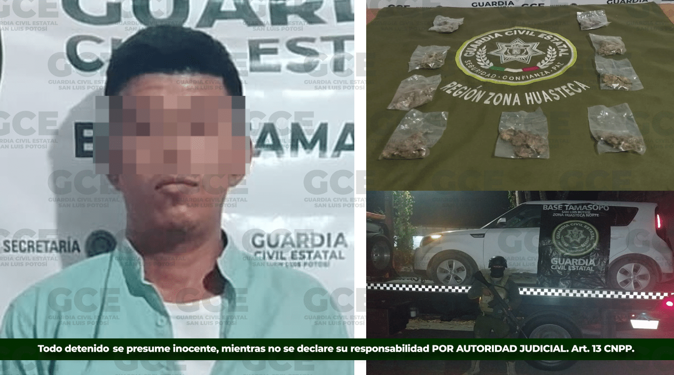 Durante un dispositivo de seguridad y prevención realizado en la zona Huasteca, se detuvo a David “N” de 37 años, en la delegación de Tambaca en el municipio de Tamasopo, quien llevaba consigo nueve bolsas de plástico con marihuana y un vehículo Kia de procedencia extranjera.