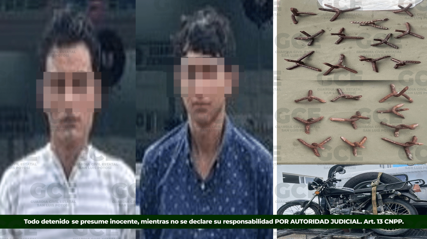 Durante la intervención, a los detenidos les fueron asegurados 22 objetos conocidos como “poncha llantas”, un teléfono celular y una motocicleta marca Italika, modelo FT125, color negro, modelo 2026.