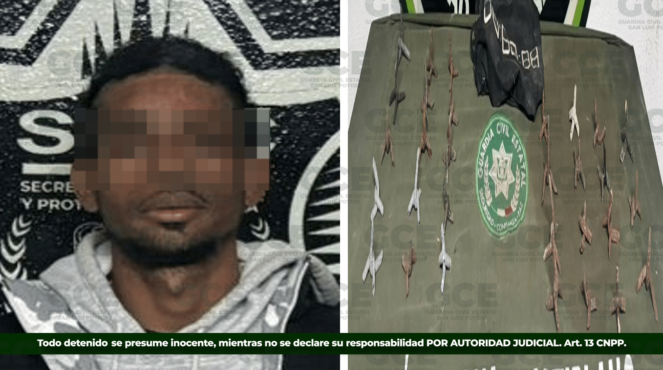 El operativo se llevó a cabo en la comunidad de Los Ángeles, en el municipio de Matehuala, donde los agentes interceptaron al individuo y procedieron a su aseguramiento tras localizar los objetos prohibidos.
