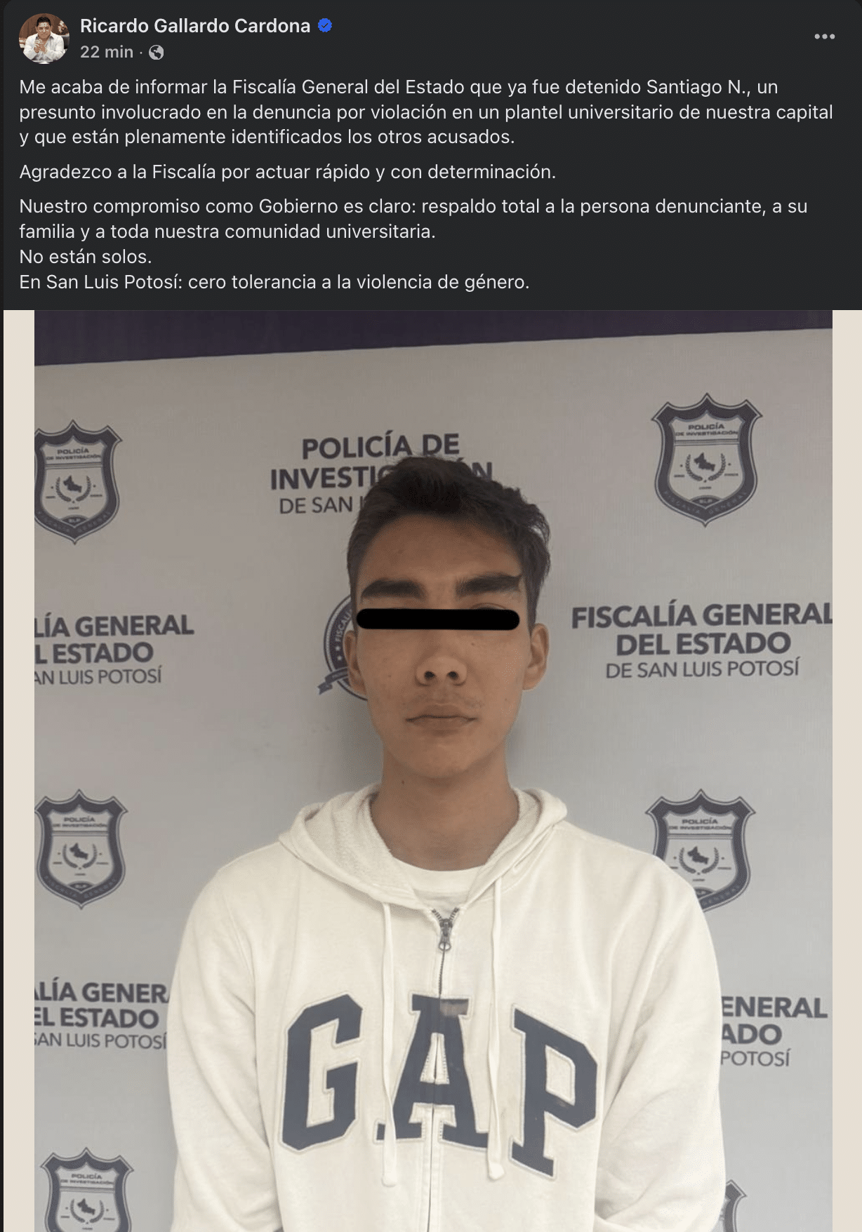 La mañana de este miércoles 22 de octubre, el gobernador Ricardo Gallardo Cardona confirmó a través de sus redes sociales la detención de Santiago «N», presuntamente involucrado en el caso de violación ocurrido en la Facultad de Derecho “Abogado Ponciano Arriaga Leija” de la Universidad Autónoma de San Luis Potosí (UASLP).