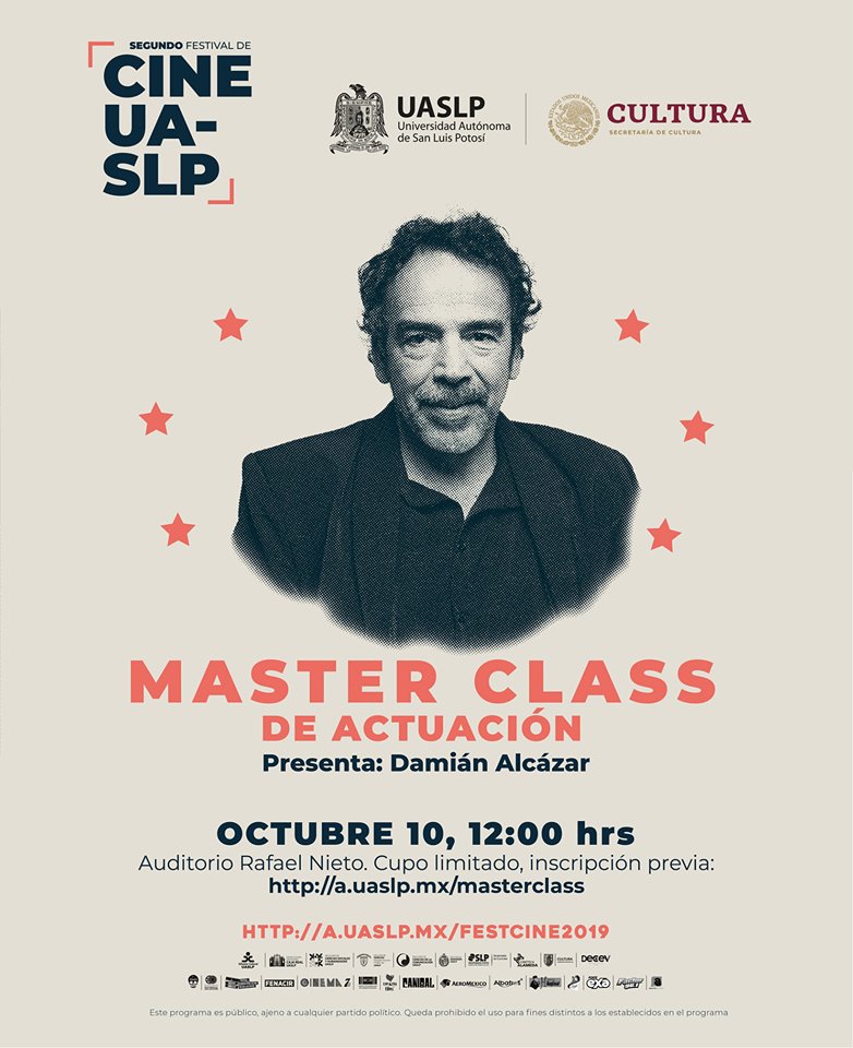 La master Class de actuación que impartirá el actor Damián Alcázar se llevará a cabo el 10 de octubre a las 12 del día, en el auditorio Rafael Nieto Compeán, para participar se requiere previa inscripción, la actividad es sin costo.