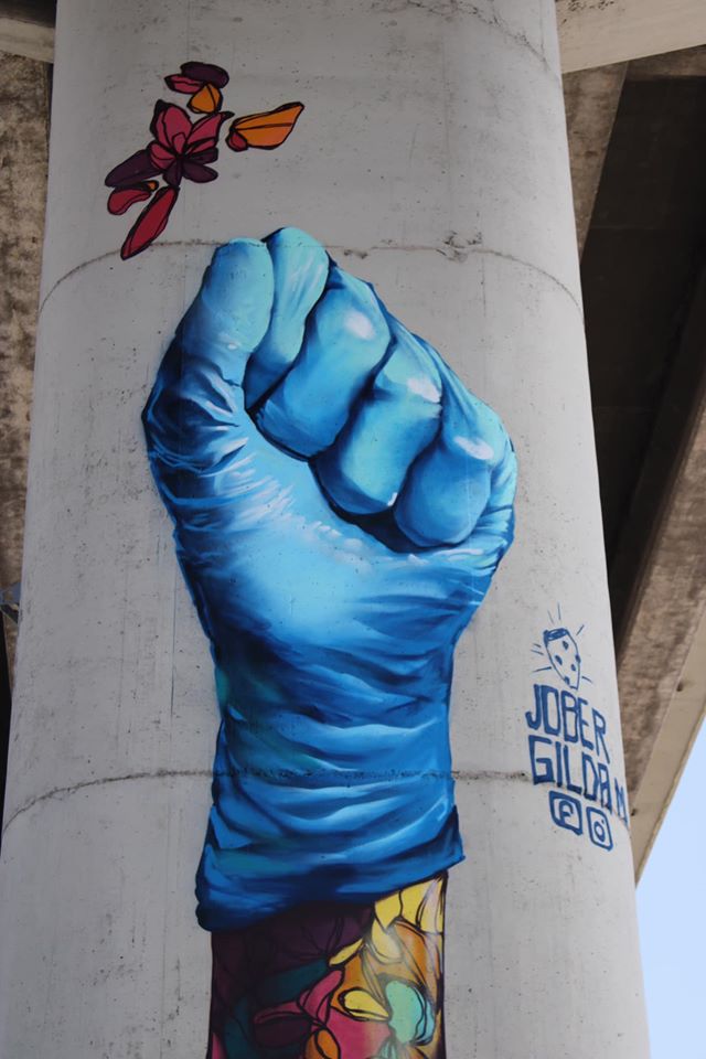 El segundo mural muestra un antebrazo que sale de un conjunto de flores y formas coloridas; en lo alto culmina con el puño cerrado cubierto con un guante quirúrgico, a un costado simplemente se puede leer ¡Fuerza!