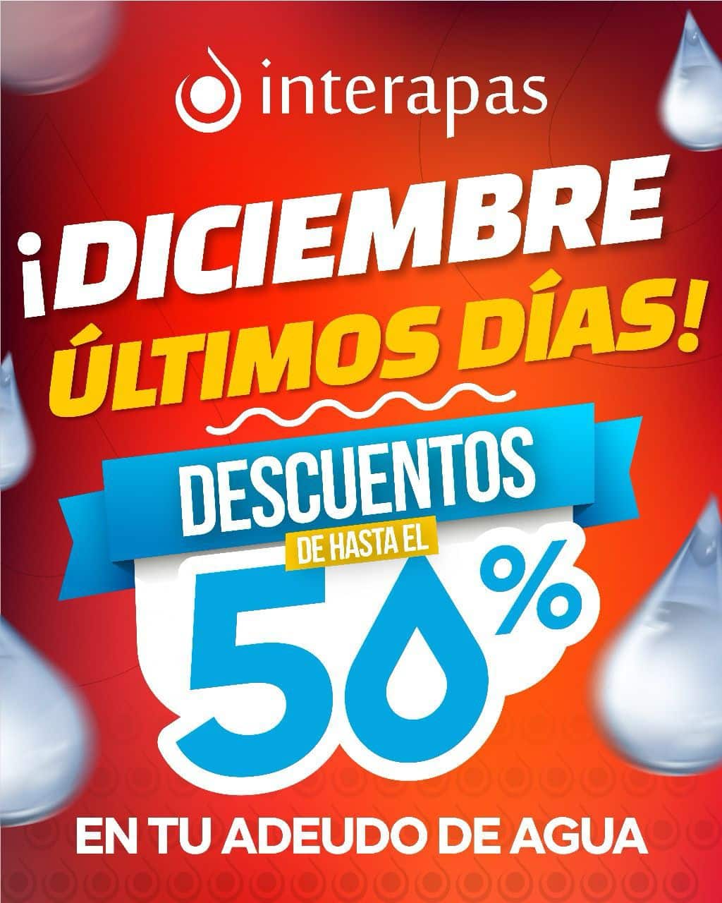 SLP.– Queda únicamente el mes de diciembre para aprovechar los incentivos fiscales del programa “Acaba tu deuda de una vez” en INTERAPAS, dirigido a usuarios domésticos y comerciales con adeudos de agua y drenaje.