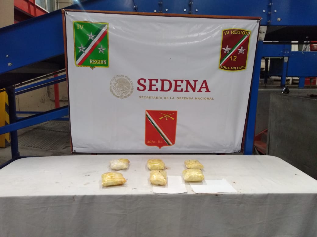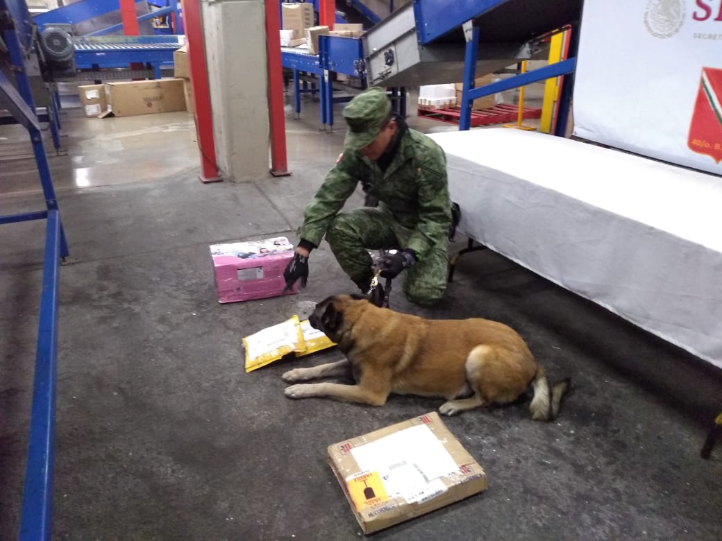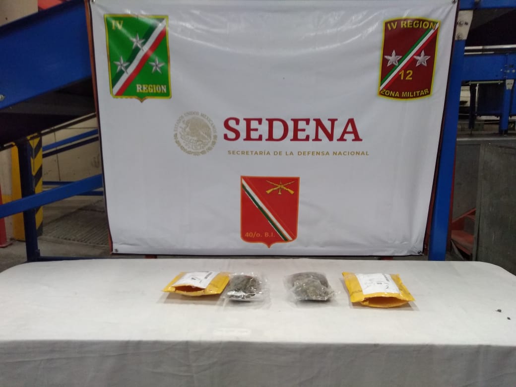 San Luis Potosí, SLP.- La Secretaría de la Defensa Nacional informa que personal militar del Aeropuerto Internacional Ponciano Arriaga, al llevar a cabo la revisión rutinaria en el servicio de paquetería, con apoyo de un binomio canófilo, aseguraron una caja y dos sobres con tres kilos 100 gramos de cristal y 220 gramos de marihuana.