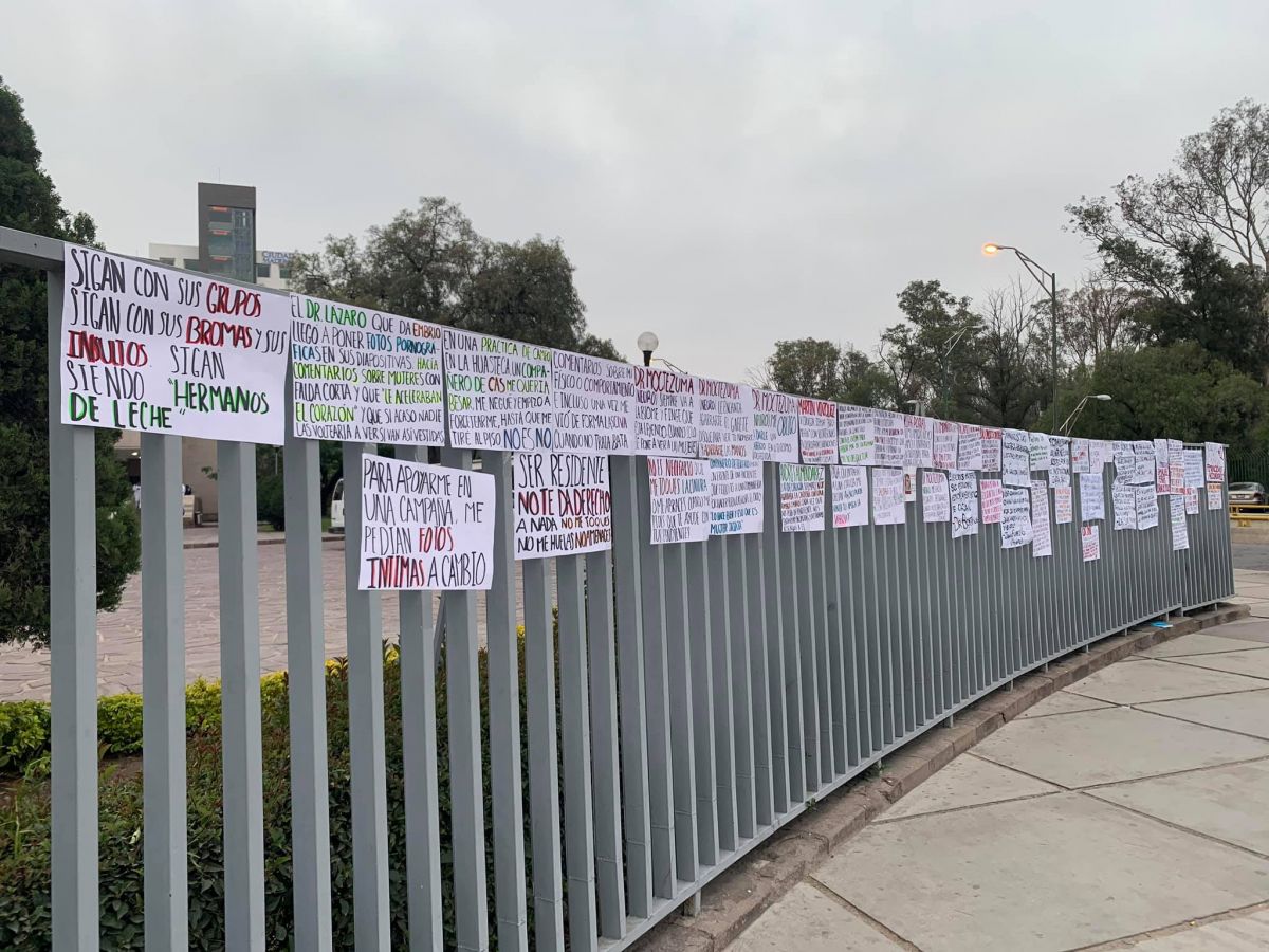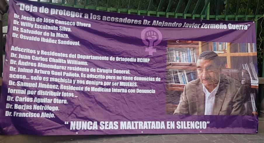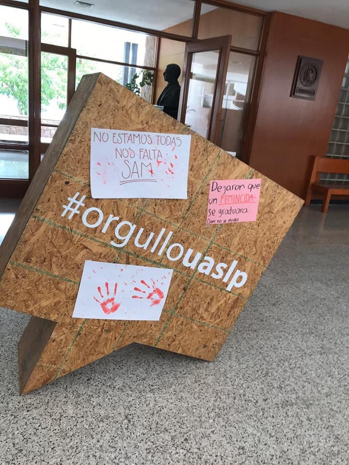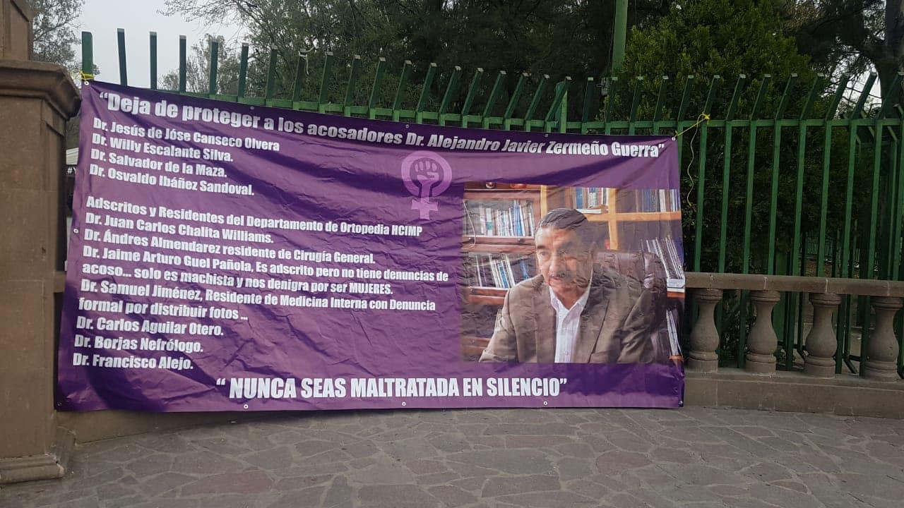 Frente a la Facultad, en la barda del parque de Morales, colgaron una lona donde acusaban al doctor Alejandro Javier Zermeño Guerra, quien busca la Rectoría, de proteger a los acosadores y de permitir que Gamaliel N. acusado del feminicidio de Samantha, en 2015, se graduara junto con su generación.
