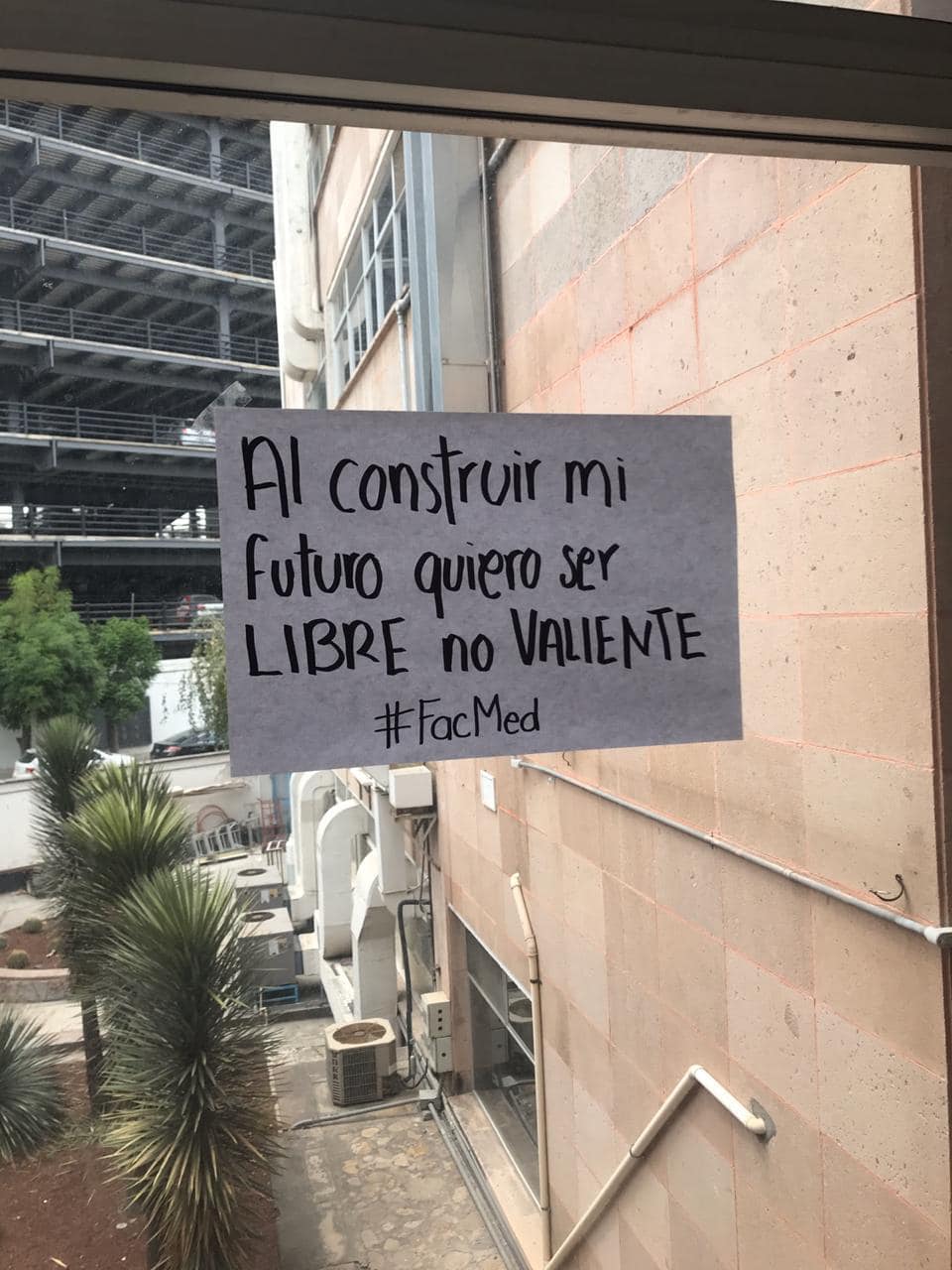 La mayoría de los estudiantes esta mañana en la Facultad eran hombres y fueron ellos quienes ayudaron a colocar todos los letreros. Durante el fin de semana, se colocaron al interior de la facultas y personal de intendencia recibió de inmediato la orden de que fueran retirados, al igual que la manta en el parque; sin embargo, los alumnos no lo permitieron.