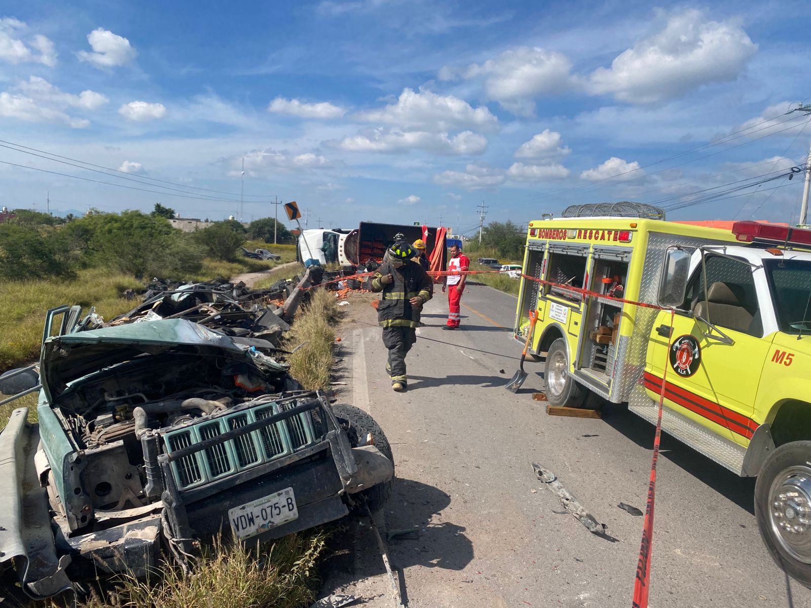 La carga de la camioneta, compuesta por cajas de tomate, quedó esparcida sobre la cinta asfáltica, lo que complicó la circulación vehicular y las labores de los cuerpos de emergencia.