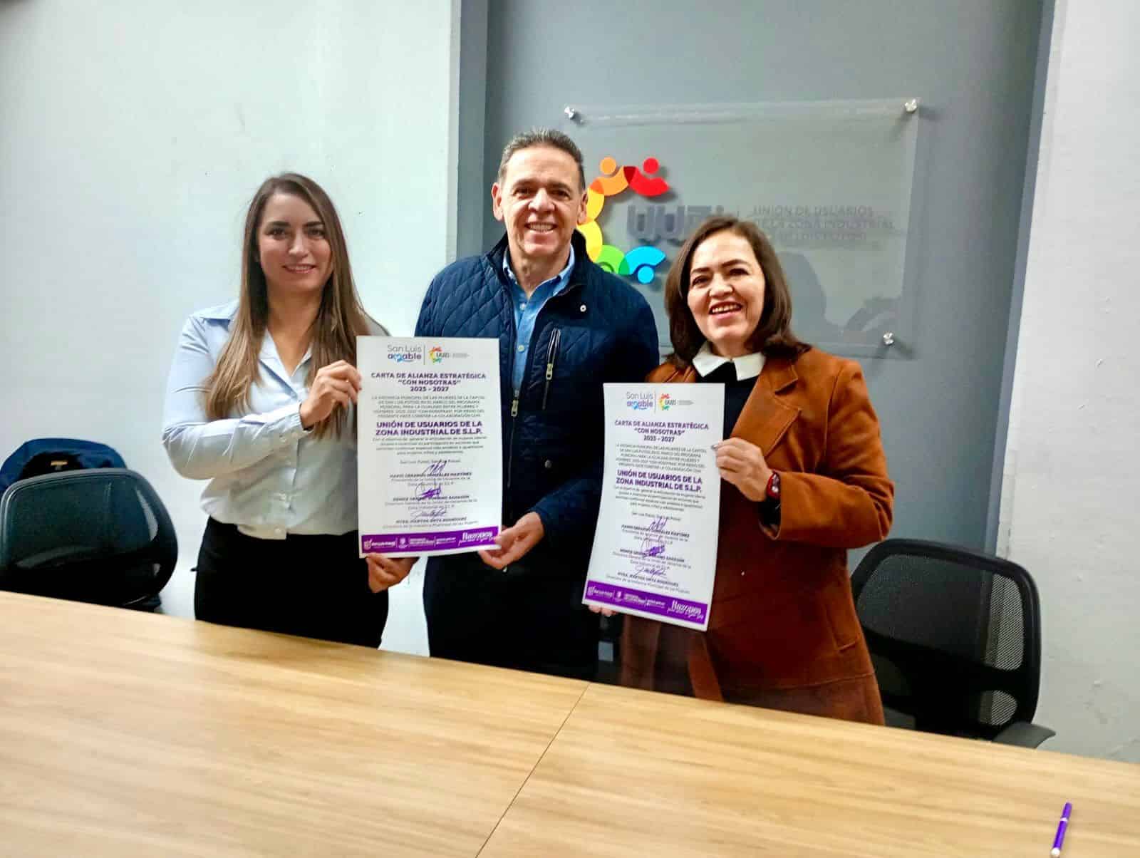 La firma de la alianza estuvo a cargo de Martha Orta Rodríguez, directora de la IMM; así como de Mario Gerardo González Martínez, presidente de la Unión de Usuarios de la Zona Industrial de San Luis Potosí, y Denice Grissel Soriano Sahagún, directora general de dicha organización.