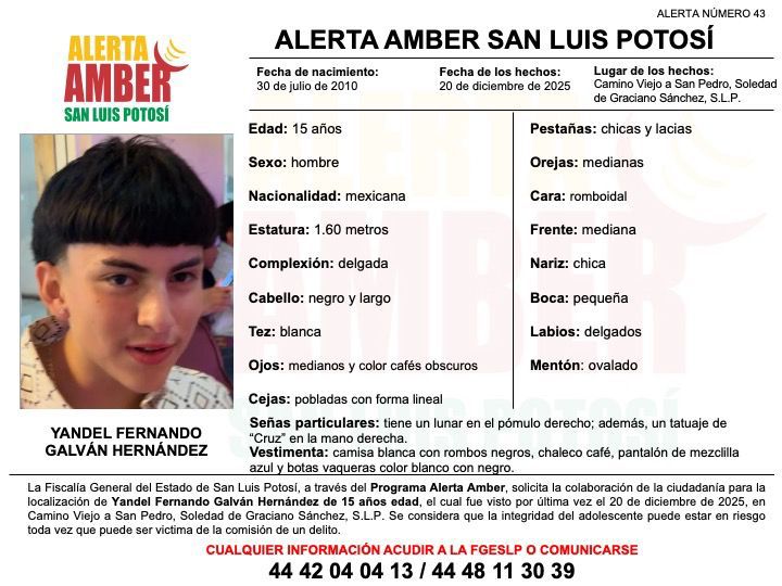 Entre el 15 y el 21 de diciembre de 2025, la Fiscalía General del Estado de San Luis Potosí logró establecer el paradero de 14 personas que habían sido reportadas como no localizadas en distintos puntos de la entidad, entre ellas dos menores de edad con Alerta Amber, quienes fueron reintegradas a sus respectivos núcleos familiares.