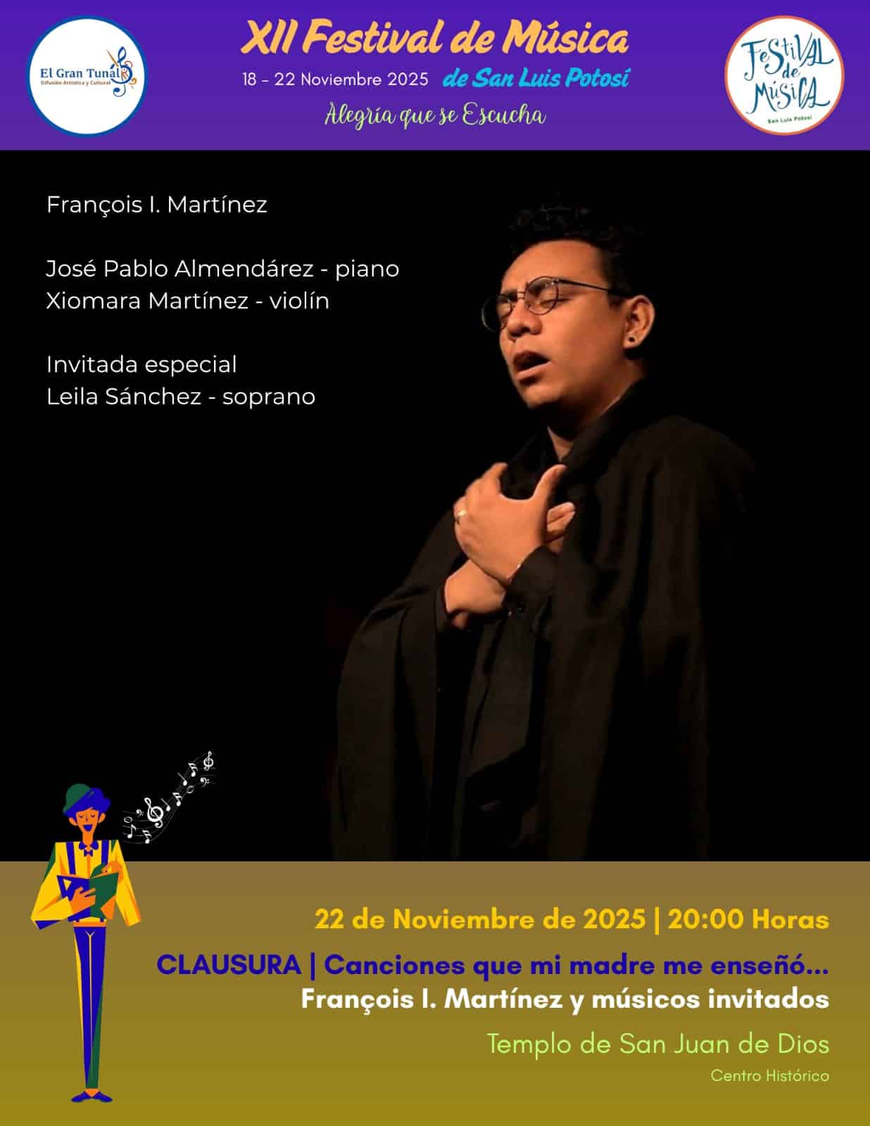 El contratenor potosino François I. Martínez será el encargado de cerrar con broche de oro la edición 2025 del Festival de Música de San Luis Potosí, con un concierto que promete emocionar al público con su elegancia vocal y su conexión con las raíces musicales de su tierra natal.