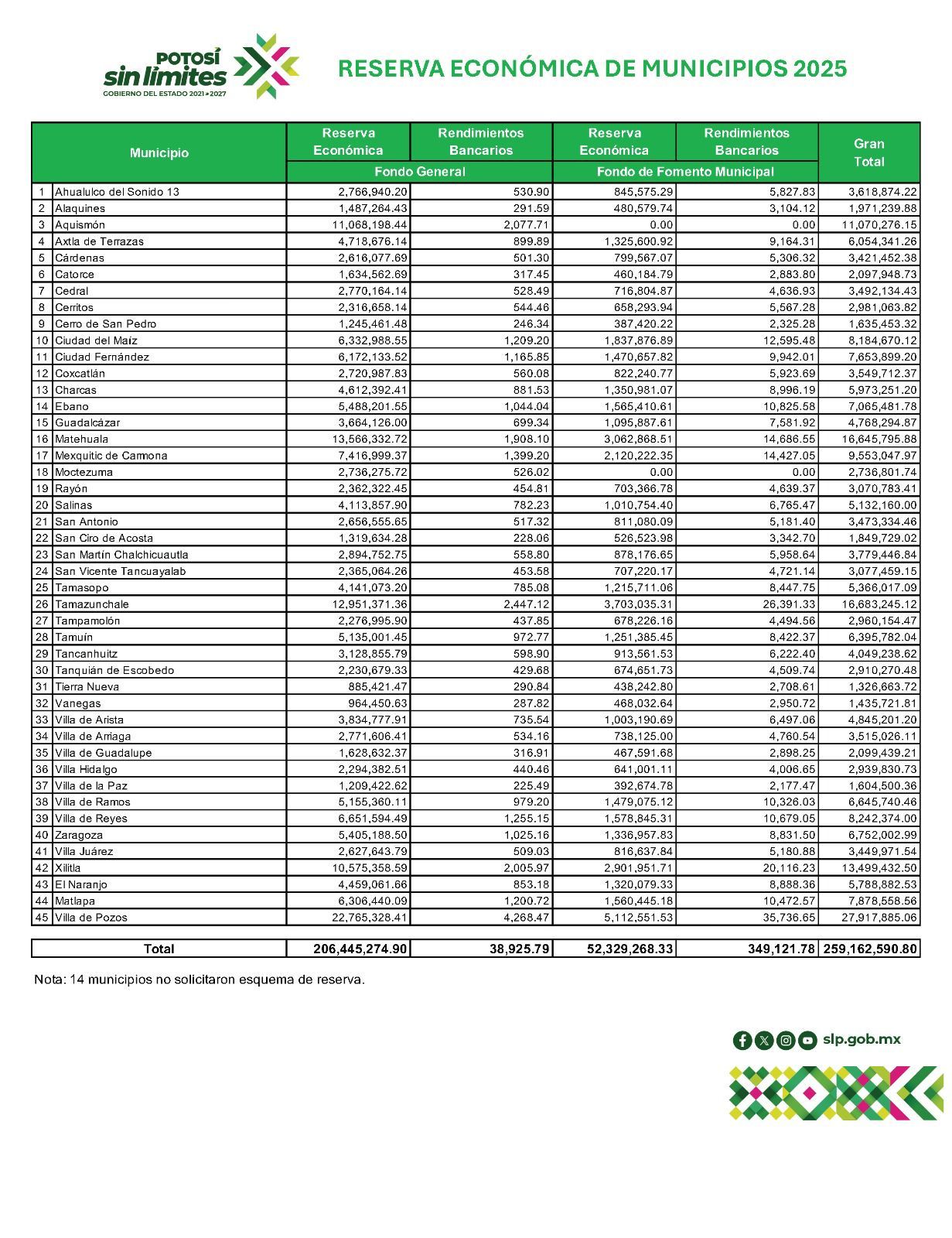 Municipios como Villa de Reyes, Soledad de Graciano Sánchez, Ciudad Valles, Rioverde, Matehuala, Tamuín y Zaragoza figuran entre los que recibirán los montos más altos, mientras que otros ayuntamientos más pequeños también accederán a sus reservas para garantizar el pago de compromisos laborales, operativos y de fin de año.