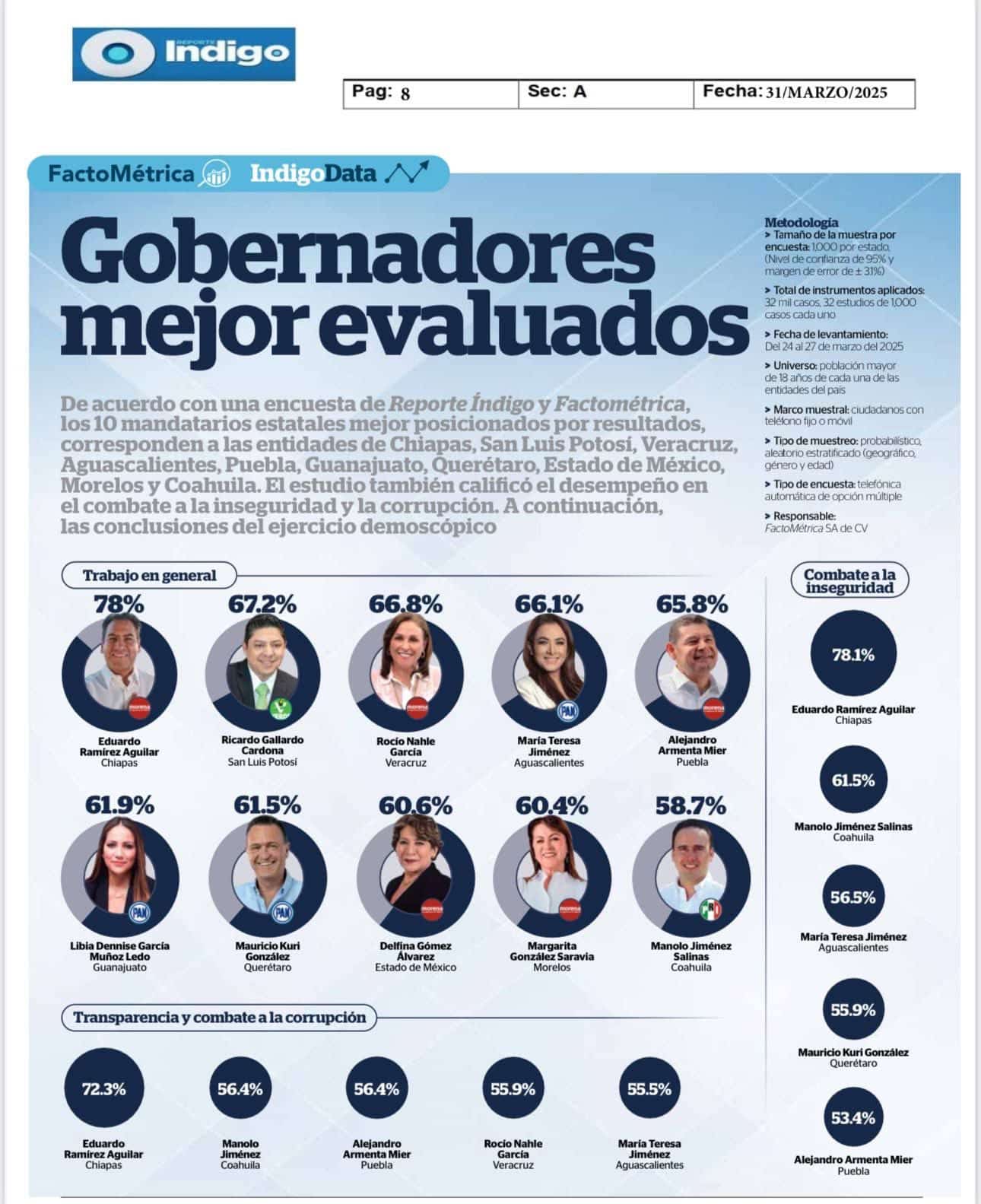 La encuesta destaca el compromiso del Gobernador en el combate a la inseguridad con un 45.8 por ciento de aprobación y un noveno lugar nacional, además de la lucha contra la corrupción a través de un 51.9 por ciento que lo ubica en séptimo lugar de todo México, lo que reafirma su liderazgo y dedicación en áreas fundamentales para el desarrollo del Estado.