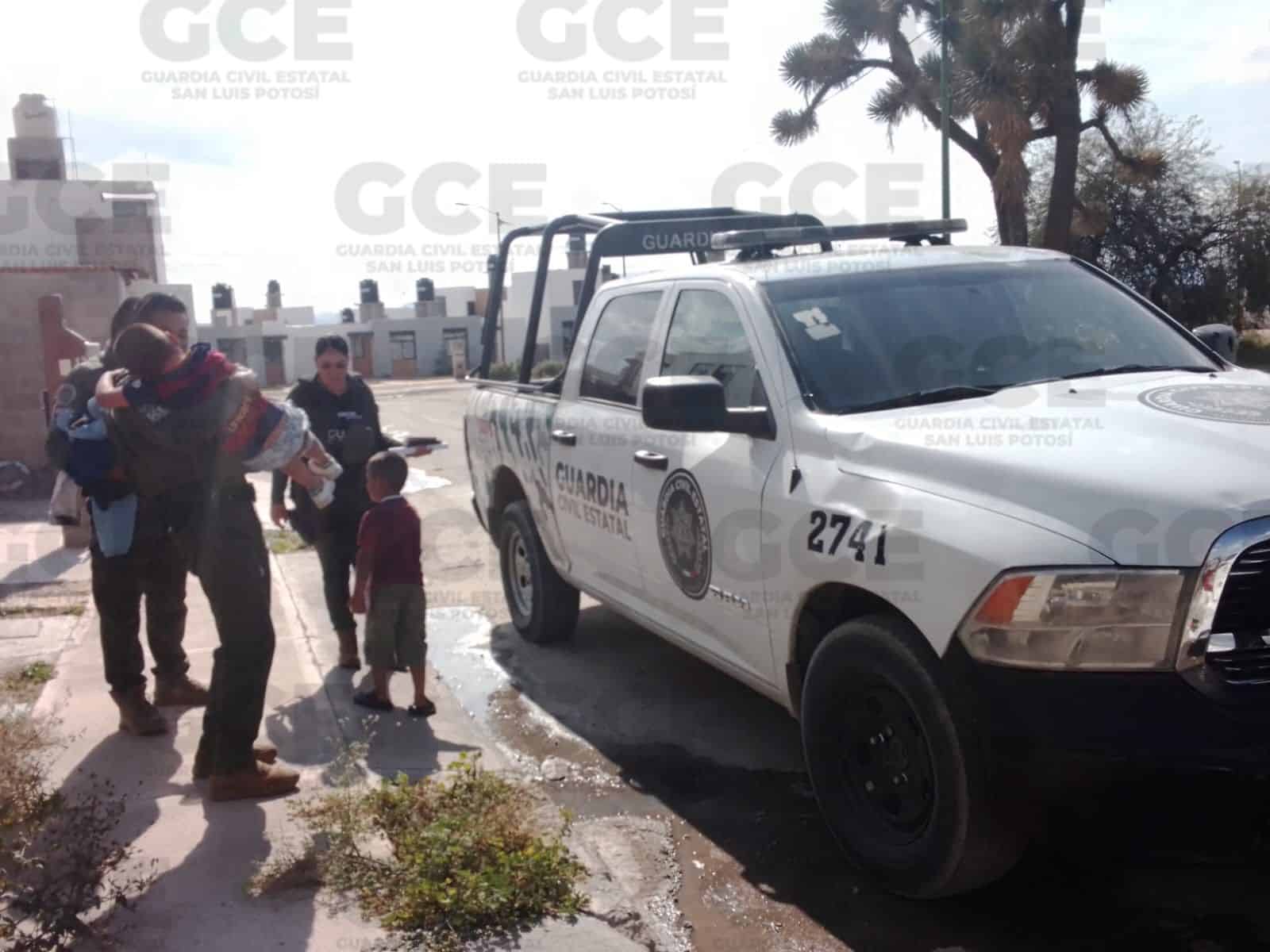 Agentes de la Guardia Civil Estatal rescataron a dos menores de edad que se encontraban solos y en situación de riesgo en una vivienda del fraccionamiento El Manantial, perteneciente al municipio de Villa de Pozos, en la capital potosina.