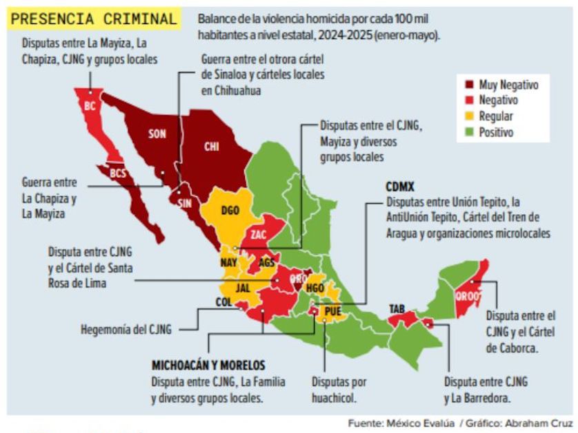 En contraste, entidades como Zacatecas, Michoacán, Morelos y Guanajuato continúan enfrentando altos niveles de homicidios. Otros estados como Sonora, Sinaloa, Querétaro, Chiapas y Baja California Sur se encuentran en alerta roja por su alta incidencia de violencia, siendo Sinaloa uno de los principales focos del conflicto que, según el informe, ha tenido efectos negativos en entidades vecinas como Baja California y Chihuahua.