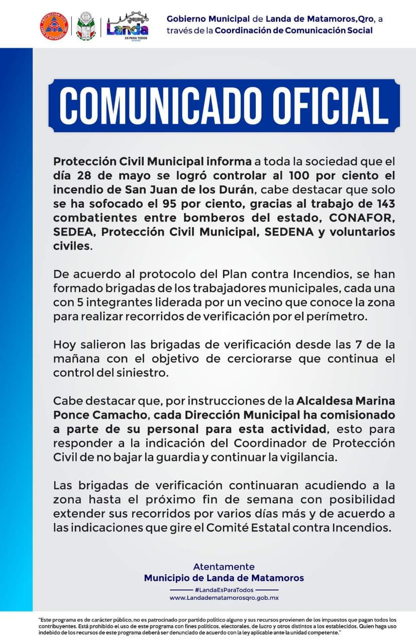 El Incendio ya se controló en el frente de Landa de Matamoros, donde se logró controlar al 100 por ciento el incendio en San Juan de los Durán, sofocando las llamas en un 95 %.