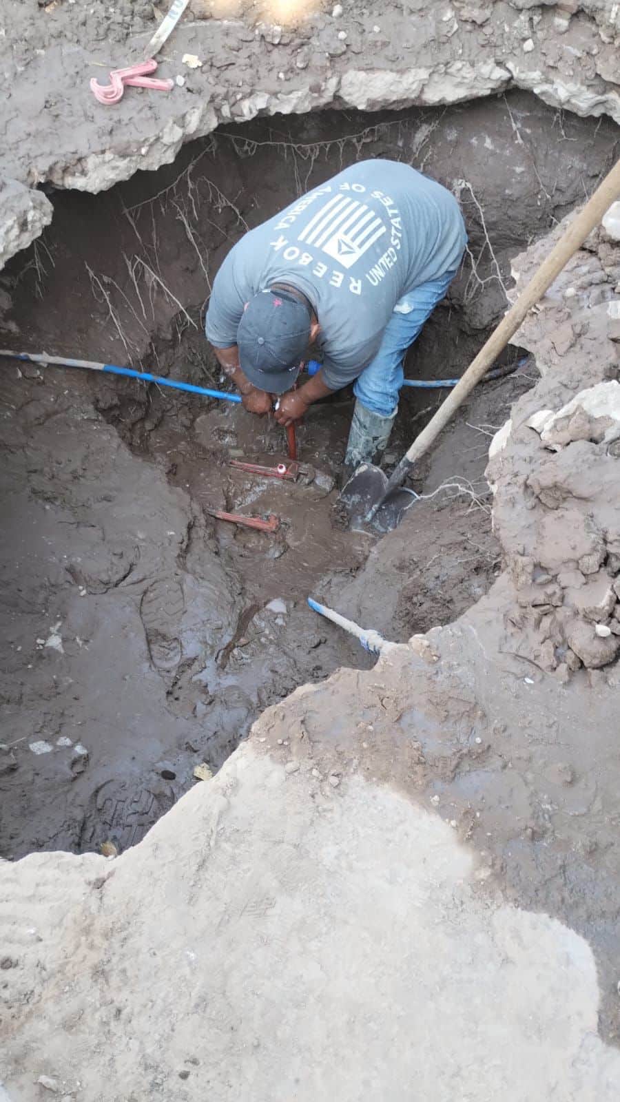 SLP.- Personal del organismo operador llevó a cabo trabajos de atención y reparación de una fuga de agua potable registrada en la calle Tirso, en la colonia Sauzalito, como parte de las acciones permanentes para el mantenimiento de la red y la atención oportuna a reportes de los usuarios.