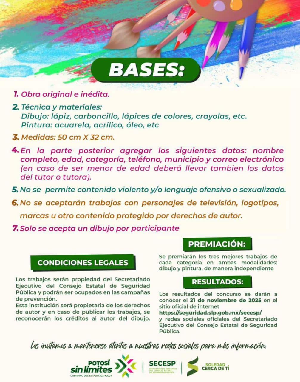 Al ser un municipio ejemplo en el cuidado y protección animal, siguiendo las directrices del Alcalde Juan Manuel Navarro Muñiz, el Ayuntamiento de Soledad de Graciano Sánchez, se suma a la convocatoria del Gobierno del Estado a través del Secretariado Ejecutivo del Consejo Estatal de Seguridad Pública (SECESP), invitando a niñas, niños y jóvenes de 8 a 18 años a participar en el Cuarto Concurso Estatal de Dibujo y Pintura 2025, con la finalidad de sensibilizar sobre el respeto y cuidado hacia los animales y prevenir el maltrato.