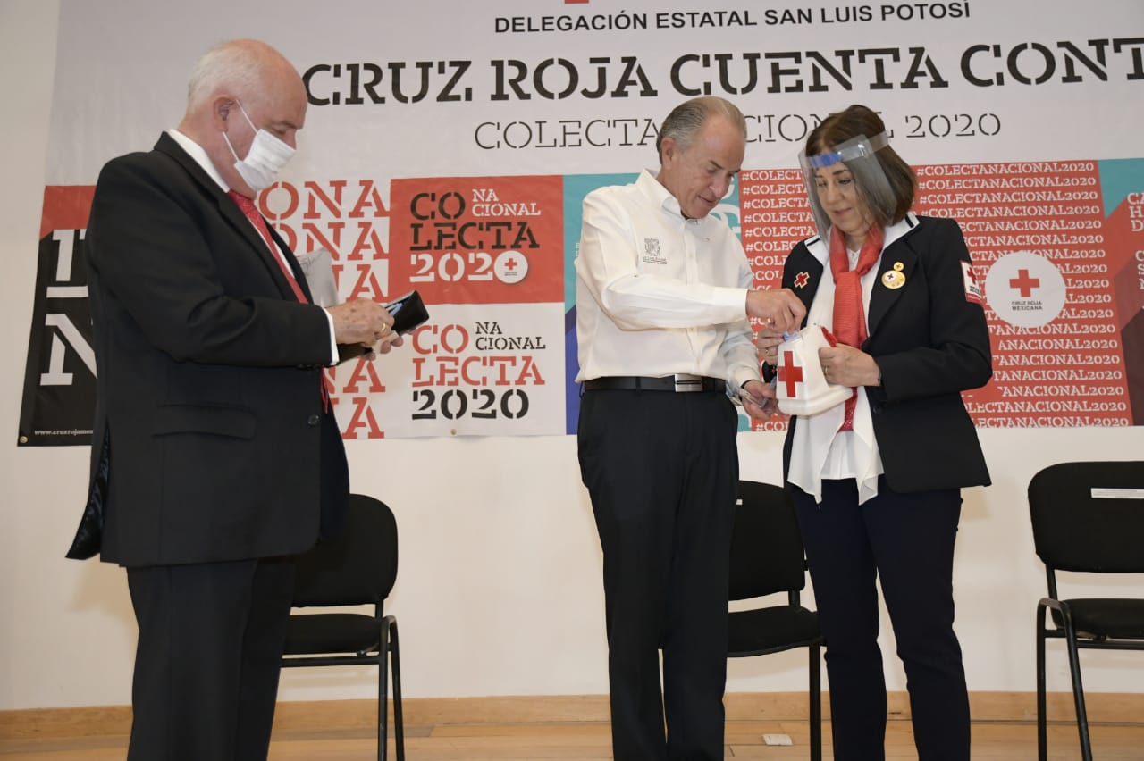 En el marco del arranque de la Colecta 2020 de la Cruz Roja Mexicana en San Luis Potosí, el Gobernador Juan Manuel Carreras López, acompañado de la Presidenta Honoraria de la institución, Lorena Valle Rodríguez y del delegado de la misma, Jesús Ernesto de la Maza Jiménez, convocan a la sociedad y a los sectores público y privados a solidarizarse con esta organización humanitaria con donativos vía electrónica, ya que desempeña una labor imprescindible, y que aporta con la atención cotidiana pre hospitalaria durante la actual emergencia sanitaria por el COVID-19.