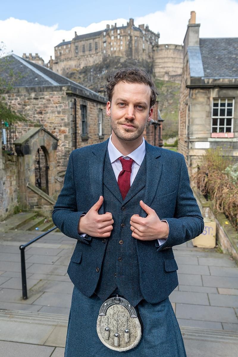 Ben Sharrock, director de Limbo posó desde Edimburgo con un atuendo escocés.