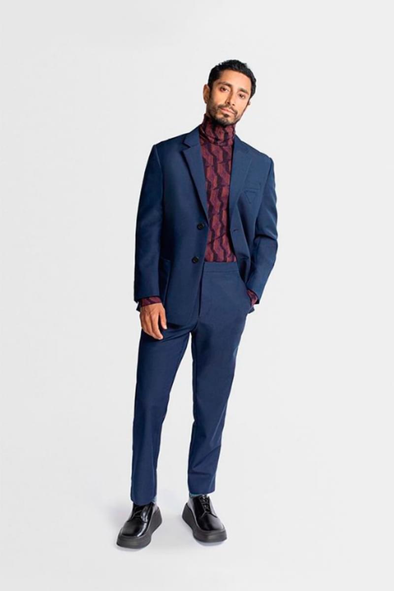 Riz Ahmed, nominado a mejor actor por «Sound of Metal» se atrevió a portar un traje con un jersey estampado de la firma de Prada.