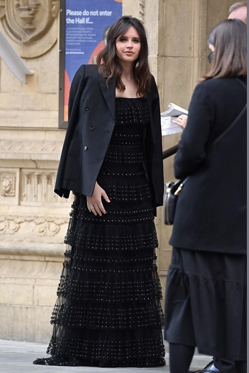 Felicity Jones, fue una de las presentadoras y en una de sus intervenciones lució este hermoso vestido negro de olanes.