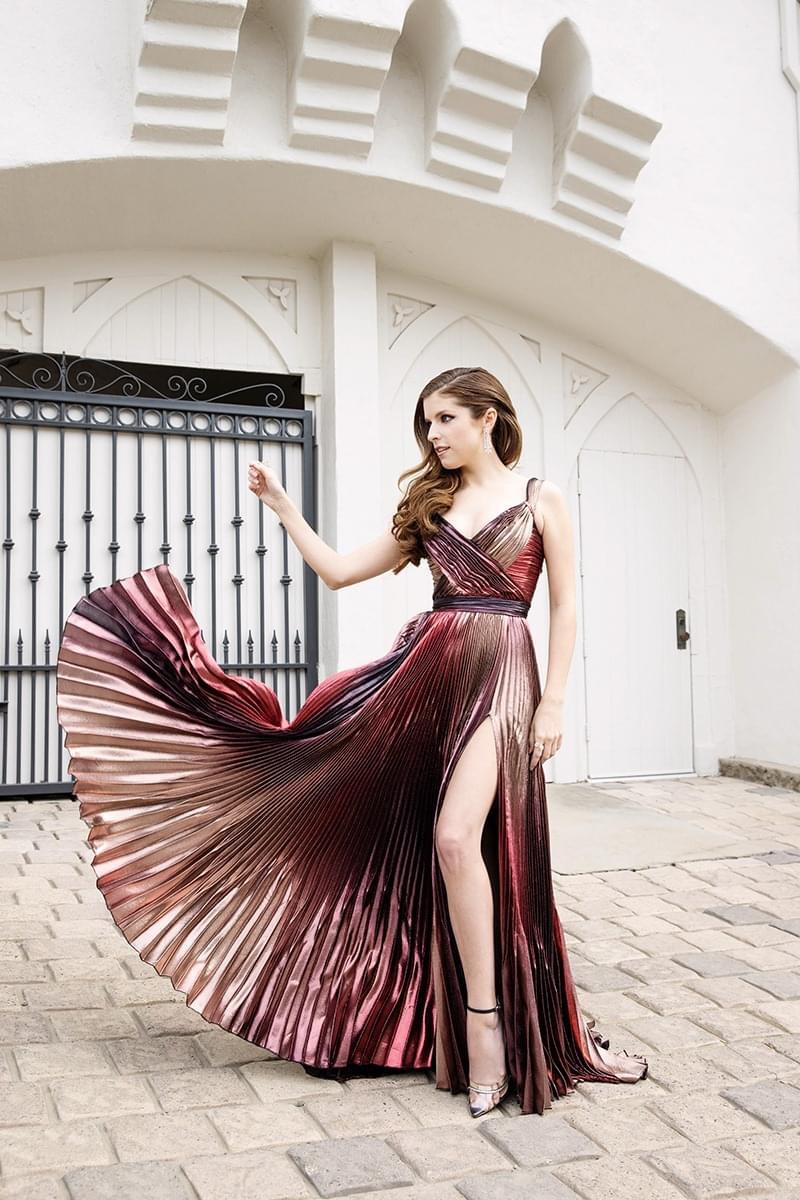 Anna Kendrick, posó desdela ciudad de lo Ángeles, con un hermoso vestido largo metalizado y con vuelo de Zuhair Murad.