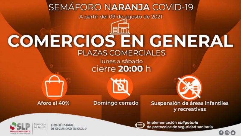 A partir del próximo lunes 9 de agosto y ya con San Luis Potosí inmerso en la tercera ola de Covid-19 San, el estado vuelve a semáforo epidemiológico naranja, por lo que las autoridades sanitarias han dado a conocer las restricciones para la operación diaria de actividades en la entidad.
