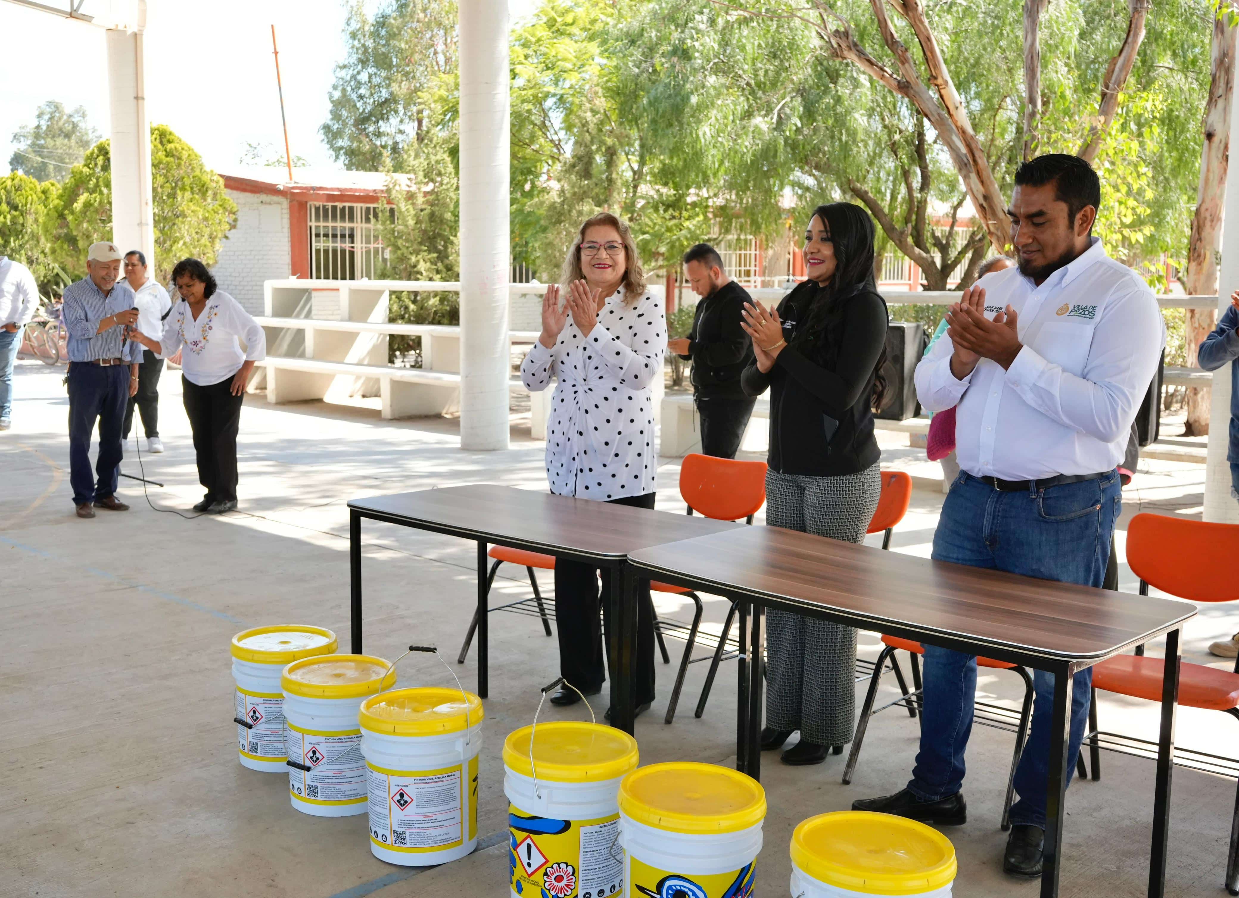 Con acciones que fortalecen la educación y para contribuir al mantenimiento de las instituciones educativas, la Presidenta Concejal de Villa de Pozos, Teresa Rivera Acevedo, realizó la entrega de botes de pintura en la Escuela Secundaria Aurelio Manrique, beneficiando directamente a más de 120 estudiantes.