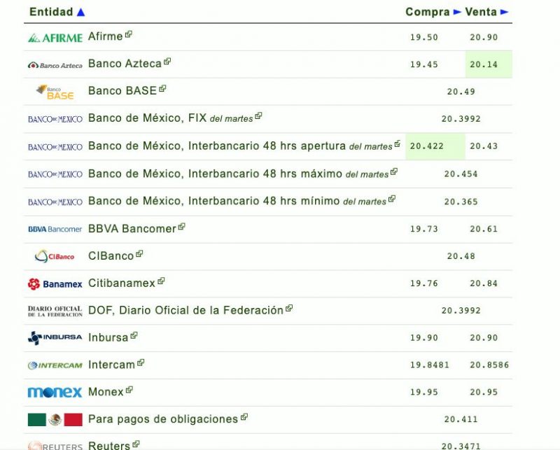 En ventanilla de los principales bancos de México y casa de cambios la moneda estadounidense cotiza en: