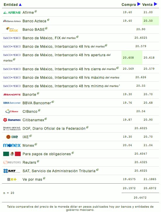 En el último año, el dólar estadounidense ha llegado a cambiarse en un máximo de 21,52 pesos mexicanos, mientras que su nivel más bajo ha sido 19,60 pesos mexicanos.