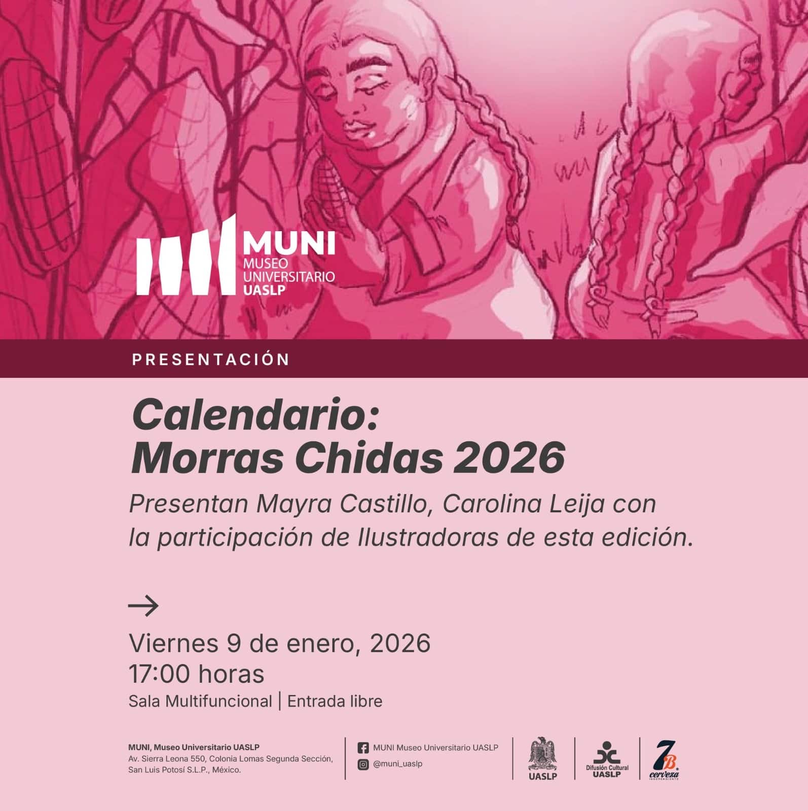 La Universidad Autónoma de San Luis Potosí (UASLP), a través de la Secretaría de Difusión Cultural y el Museo Universitario (MUNI), invita al público en general a la presentación del calendario “Morras Chidas 2026”, que se llevará a cabo el viernes 9 de enero de 2026, a las 17:00 horas, en la Sala Multifuncional, con entrada libre.