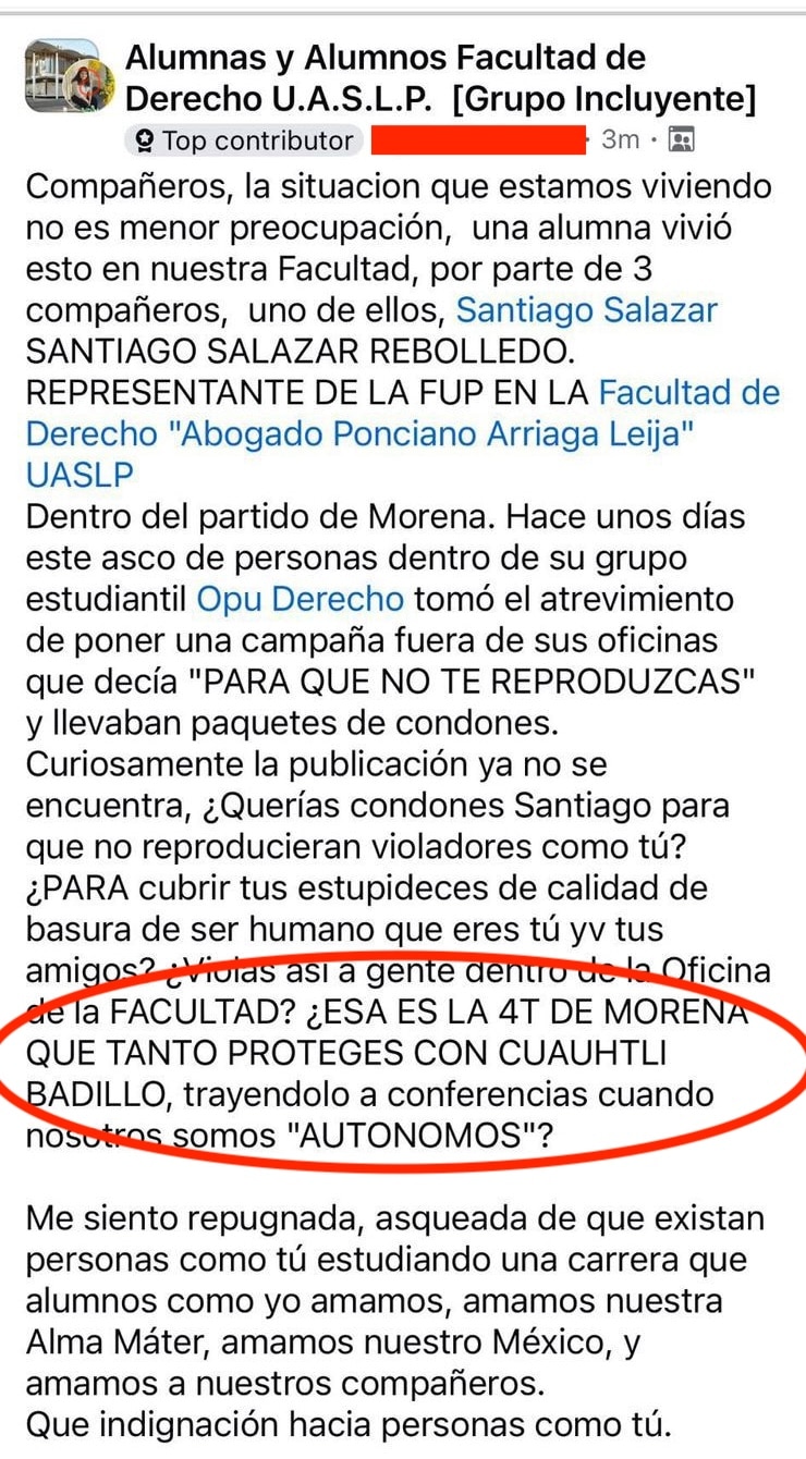 El nombre más sonado dentro de las denuncias de los universitarios sería el de Santiago «N», quien resulta ser el Secretario General de la Coordinación Estatal Jóvenes Morena en San Luis Potosí. Según denuncias en redes sociales, el joven estaría apadrinado por el diputado local, Cuauhtli Badillo Moreno, destacado miembro del partido guinda en el territorio potosino.