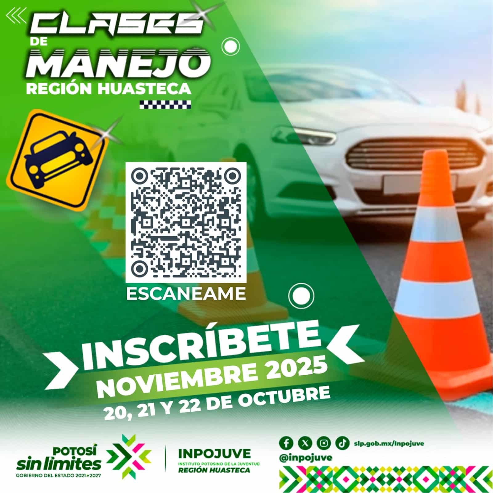 El Gobierno del Estado fomenta la educación vial a través del Instituto Potosino de la Juventud (Inpojuve), abriendo inscripciones para las clases de manejo en la Huasteca durante el mes de noviembre. Las inscripciones se realizarán del 20 al 22 de octubre en las oficinas de la dependencia en la región, ubicadas en calle Morelos 104 interior L9, zona centro de Ciudad Valles.