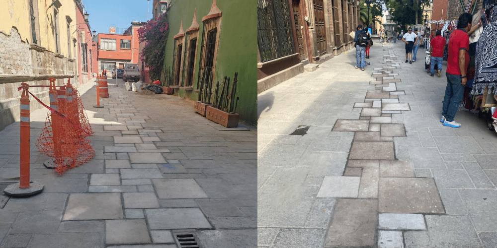La intervención consistió en la sustitución de 45 metros lineales de tubería de la red de drenaje, realizados en dos etapas para mantener en operación la zona comercial y artesanal, así como el tránsito peatonal característico de este corredor.