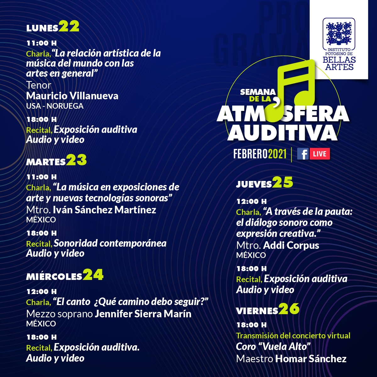 Siguiendo con la difusión de eventos artísticos de manera virtual, la Secretaria de Cultura, a través del Instituto Potosino de Bellas Artes (IPBA), invita a disfrutar por medio de sus redes oficiales las actividades que se expondrán en la “Semana de la Atmósfera Auditiva”, que iniciará el lunes 22 y hasta el 26 de febrero, contando con importantes ponentes musicales tanto del país como extranjeros, informó el titular de la dependencia, Armando Herrera Silva.