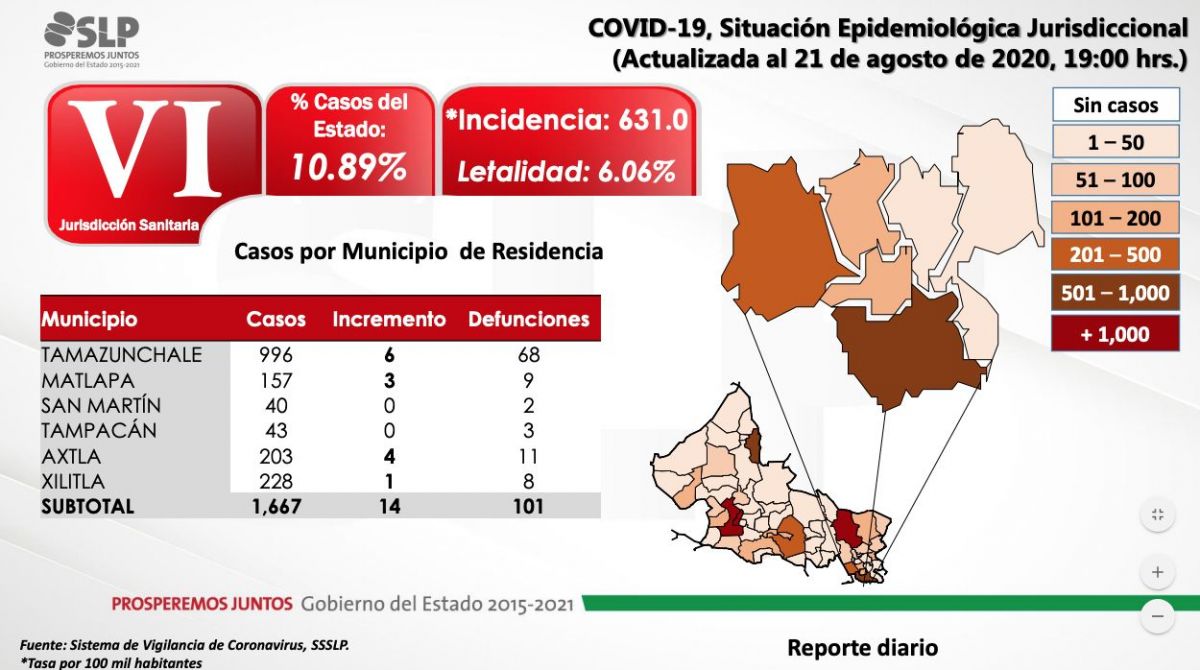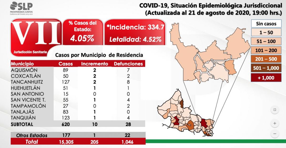 En el estado suman 15 mil 305 casos positivos y 1,046 lamentables defunciones desde el inicio de la pandemia. La tasa de letalidad se encuentra en 6.83 por ciento por cada 100 pacientes Covid.