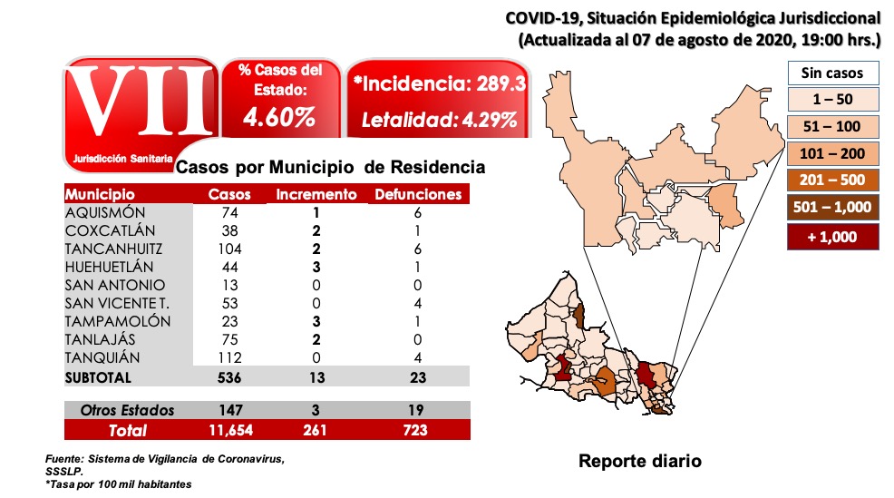 El Comité de Seguridad Sanitaria de SLP informa sobre el avance de la pandemia Covid – 19 en el estado , en las últimas 24 horas se confirmaron 261 casos y 24 defunciones. Suman en la entidad, desde el inicio de la pandemia 11,654 casos positivos y 723 defunciones. La tasa de mortalidad se encuentra en 6.20 por ciento.