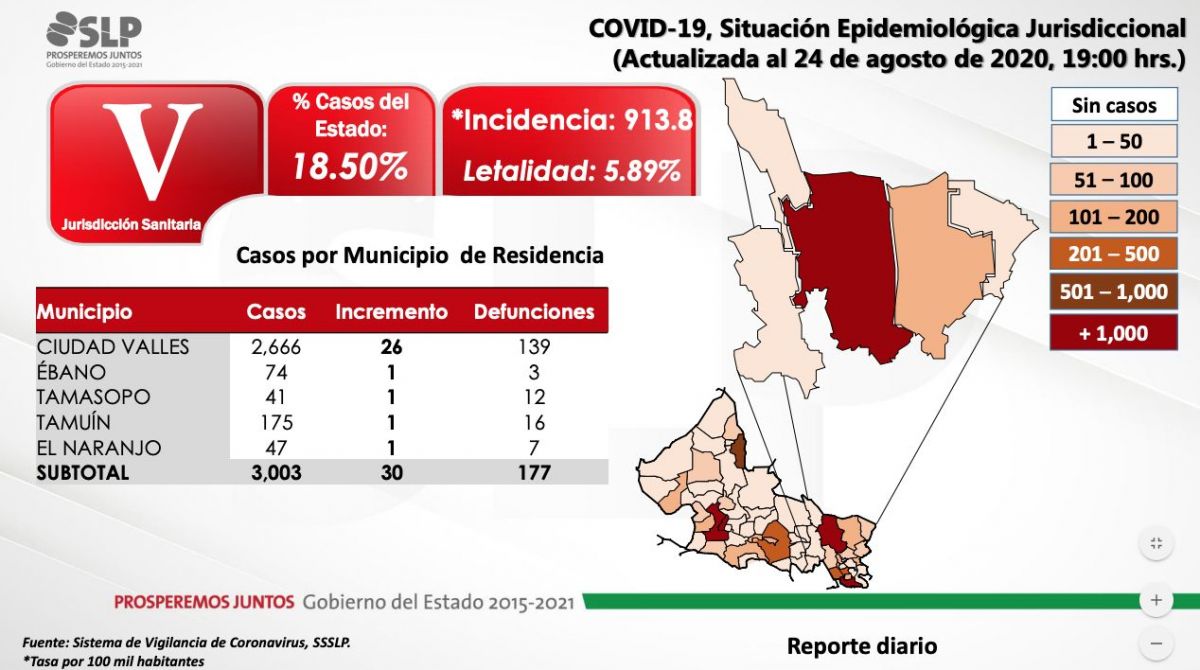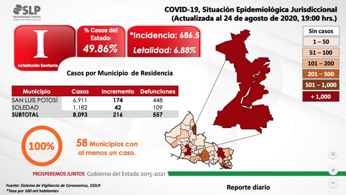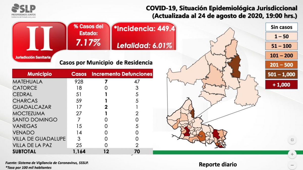 Los municipios con mayor número de fallecidos siguen siendo SLP capital, seguido de Ciudad Valles y Soledad de Graciano. En la entidad han fallecido 23 personas originarias de otro estado que demandaron atención médica en algún hospital potosino.