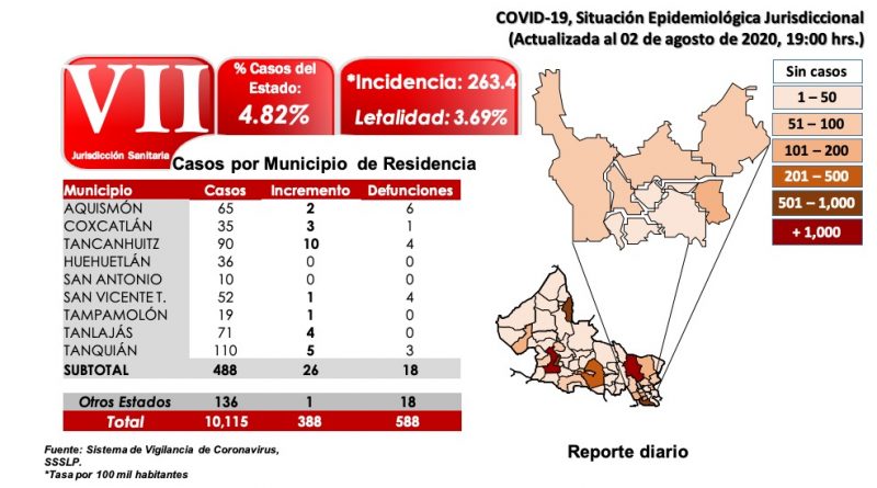 De los nuevos casos positivos 202 son varones y 186 mujeres, en rangos de edad de 2 a 93 años y tipo de exposición local en 387 de los casos y uno foráneo. La residencia de los nuevos confirmador corresponde a: 212 capital, 14 Soledad de Graciano, 16 Matehuala, 1 Cedral, 1 Venado, 1 Villa de Arista, 3 Mexquitic, 1 Villa de Reyes, 1 Ciudad Fernández, 4 Rioverde, 1 Alaquines, 2 Cerritos, 1 Villa Juárez, 88 Ciudad Valles, 4 Ébano, 1 Tamuín, 5 Tamazunchale, 2 Axtla, 3 Xilitla, 2 Aquismón, 3 Coxcatlán, 10 Tancanhuitz, 1 San Vicente, 1 Tampamolón, 4 Tanlajás y 5 Tanquián.