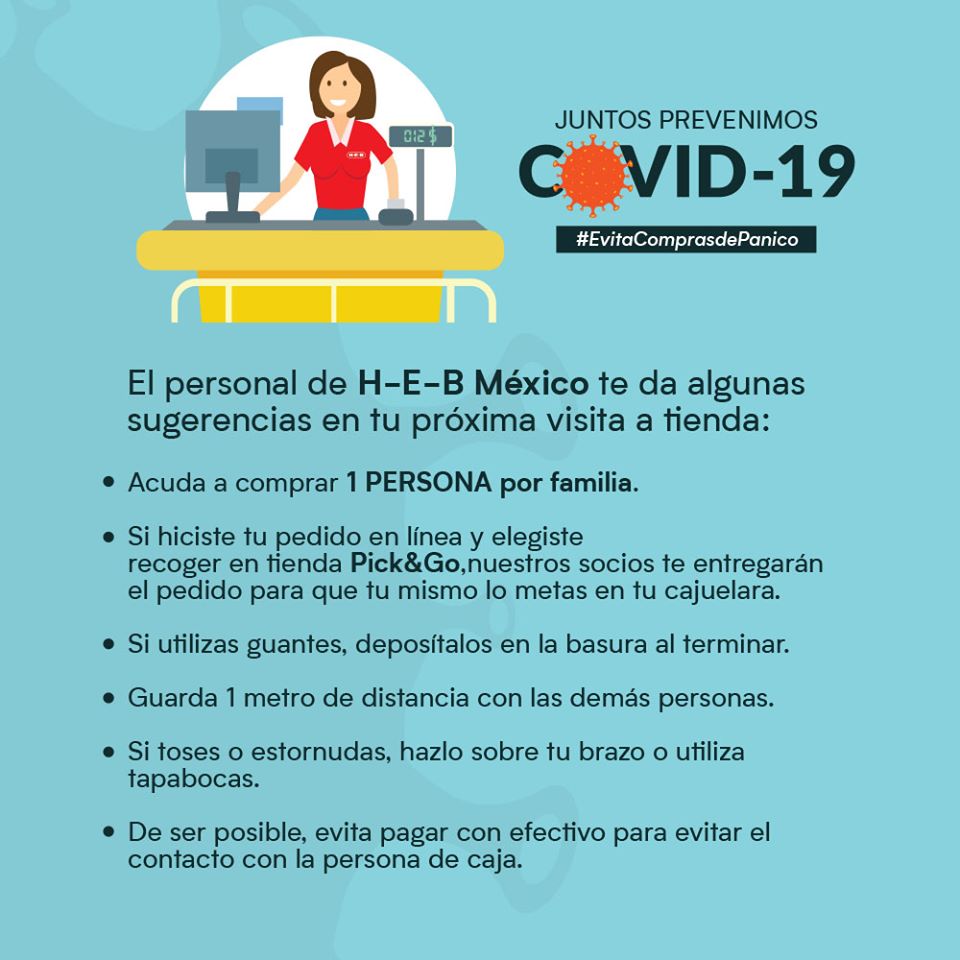 De igual manera recomiendan a todos los clientes que sólo una persona por familia realice las compras o, de preferencia, las realicen por internet y solo acudan a recoger sus productos. También, utilizar guantes y depositarlos en la basura al salir, guardar un metro de distancia entre personas, cubrirse con el brazo al toser o estornudar y, de ser posible, pagar mejor con tarjeta que con efectivo y así no tener contacto con la persona en caja.