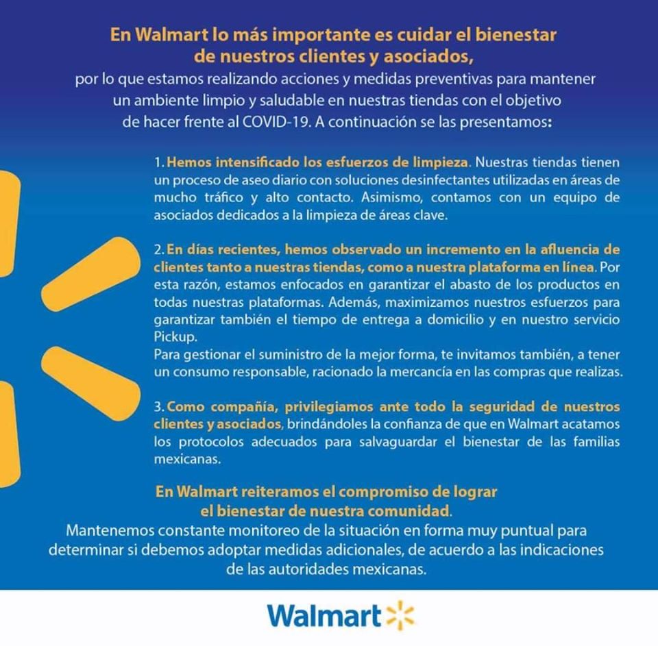 También invitaron a no agotar productos de salud como tapabocas, pues estos no previenen el contagio del Coronavirus. En un comunicado de Walmart de México, señalan que en sus tiendas, como Aurrera, Superama y Sams, piden hacer un consumo responsable de todo producto para poderlo racionar.