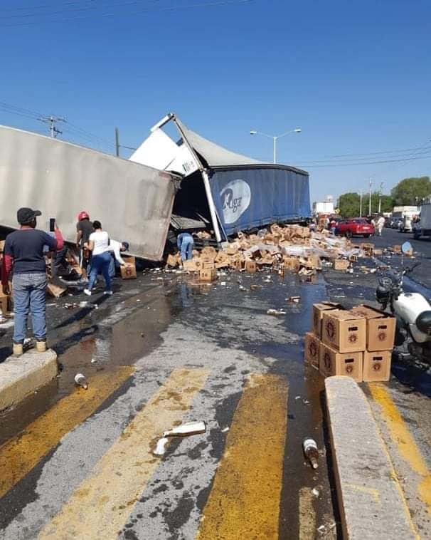La mañana de este jueves, un trailer de doble remolque cargado con miles de cajas de cerveza de Grupo Modelo se volteó en la carretera a Zacatecas, frente al parque industrial de Pueblo Viejo. En el lugar, la rapiña no se hizo esperar y los lugareños comenzaron a “surtirse” para la cuarentena.