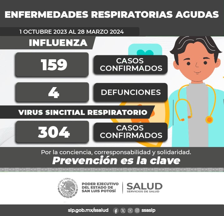 Al registrarse cuatro nuevos casos de influenza del 22 al 28 de marzo, suman 159 casos acumulados de octubre 2023 inicio de la temporada invernal a marzo 28 del 2024, y al no haber nuevos casos de de virus sincitial respiratorio, se mantiene la cifra de octubre 2023 a marzo 28 2024 en 304.